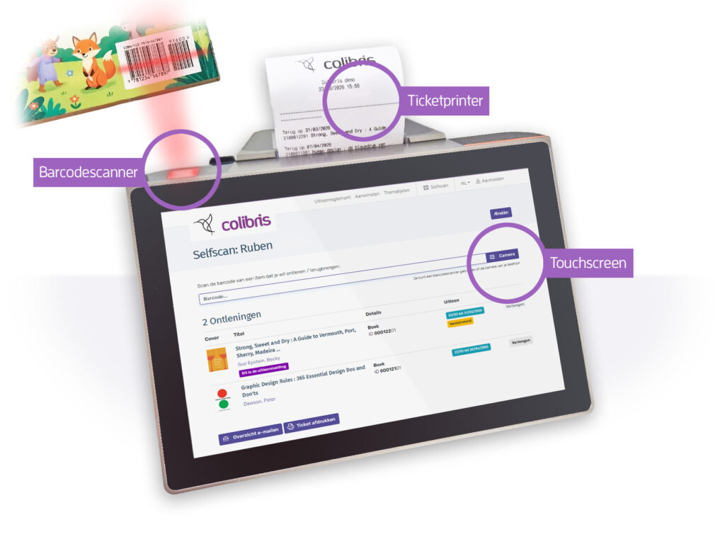 De Colibris Kiosk is een all-in-one toestel met een touchscreen, een ingebouwde barcodescanner en een ticketprinter. Leners kunnen er zelfstandig hun uitleen registreren.