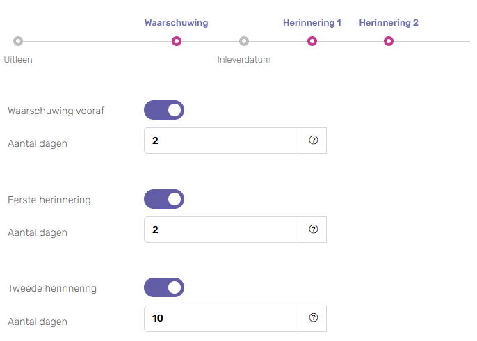 - Waarschuwing: standaard 2 dagen voor de voorziene inleverdatum