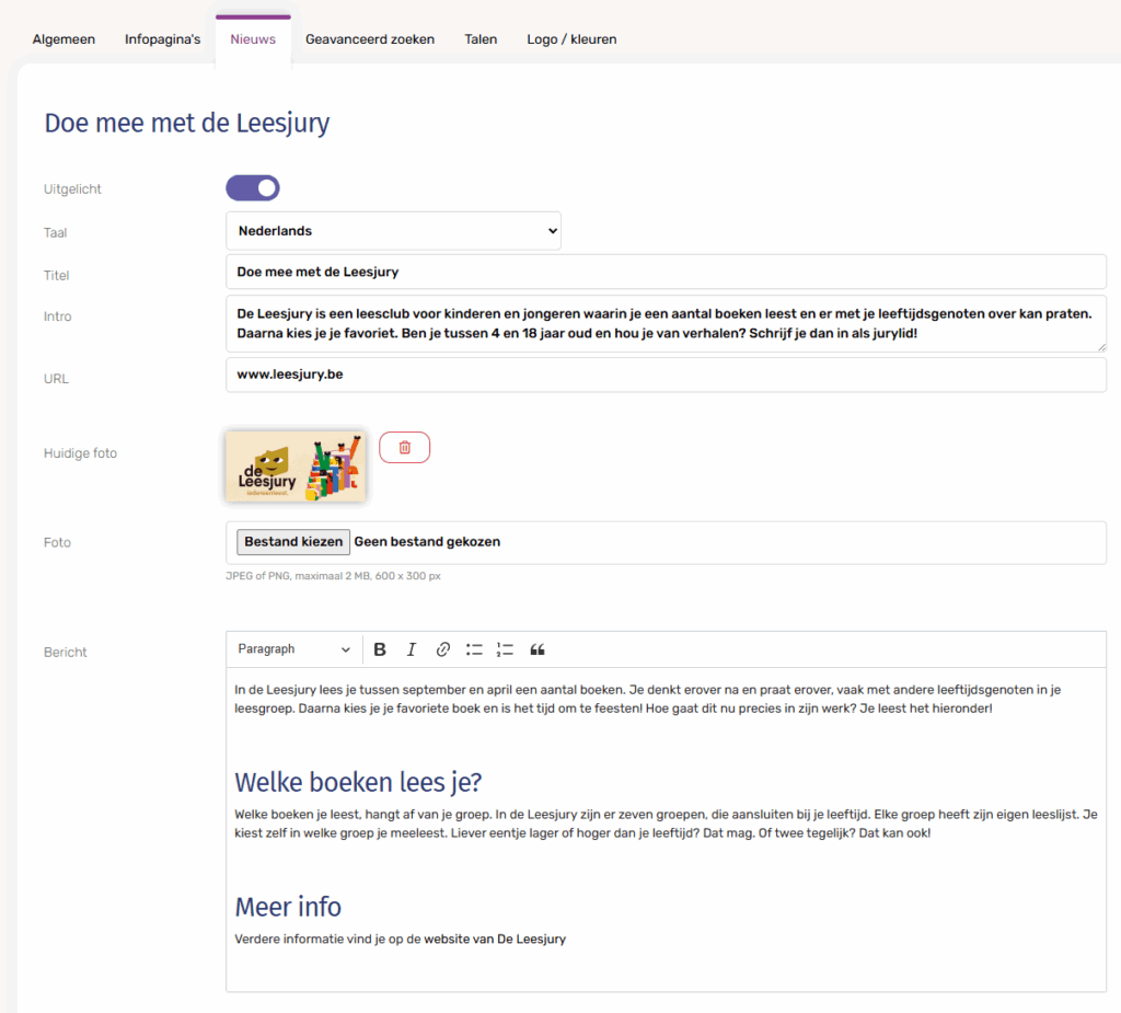 Artikels worden beheerd via Instellingen > Publiek gedeelte > Nieuws.