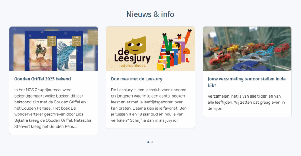 Het blok Nieuws & info verschijnt pas nadat een eerste artikel is toegevoegd. Er zijn maximaal 3 artikels zichtbaar. Daarnaast kunnen er nog 3 extra artikels worden getoond, in een carrouselvorm. Zes is het maximum.