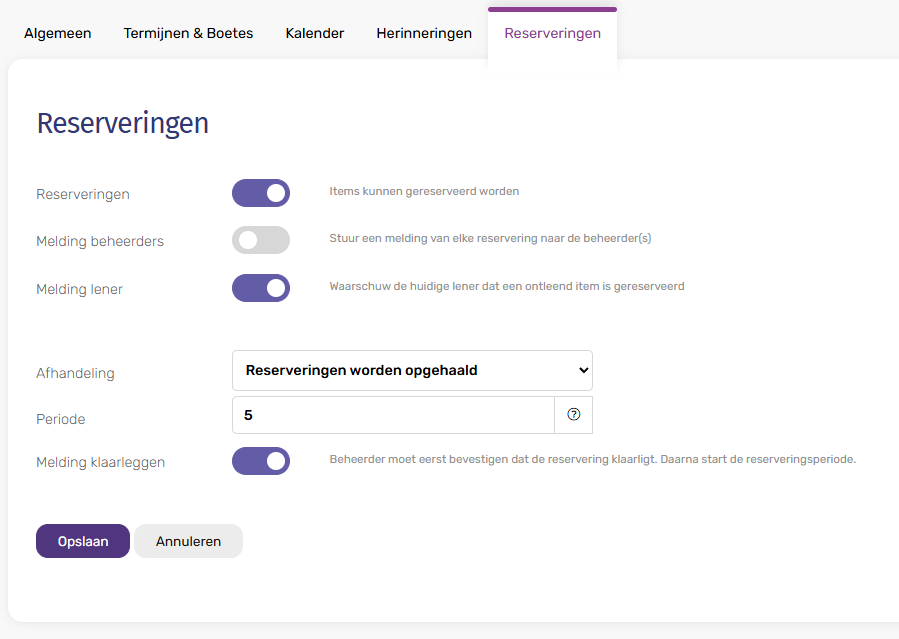 Met dit vinkje bepaal je of reserveringen mogelijk zijn of niet. Wanneer dit is uitgeschakeld, zal er geen mogelijkheid getoond worden aan leners om items te reserveren. Alle andere opties zijn daarmee ook irrelevant.